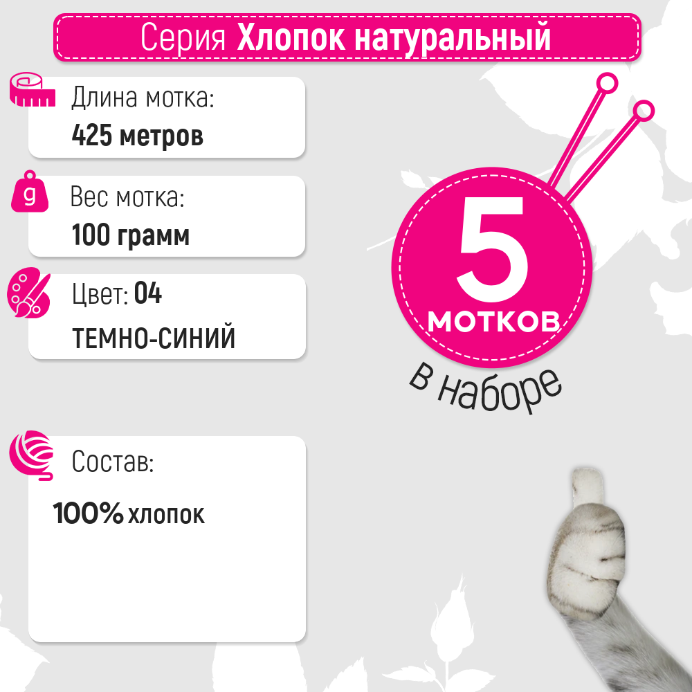 Пряжа для вязания Пехорка 'Хлопок натуральный 'Кабле' 100гр. 425м. (100% хлопок) (04 темно-синий), 5 мотков