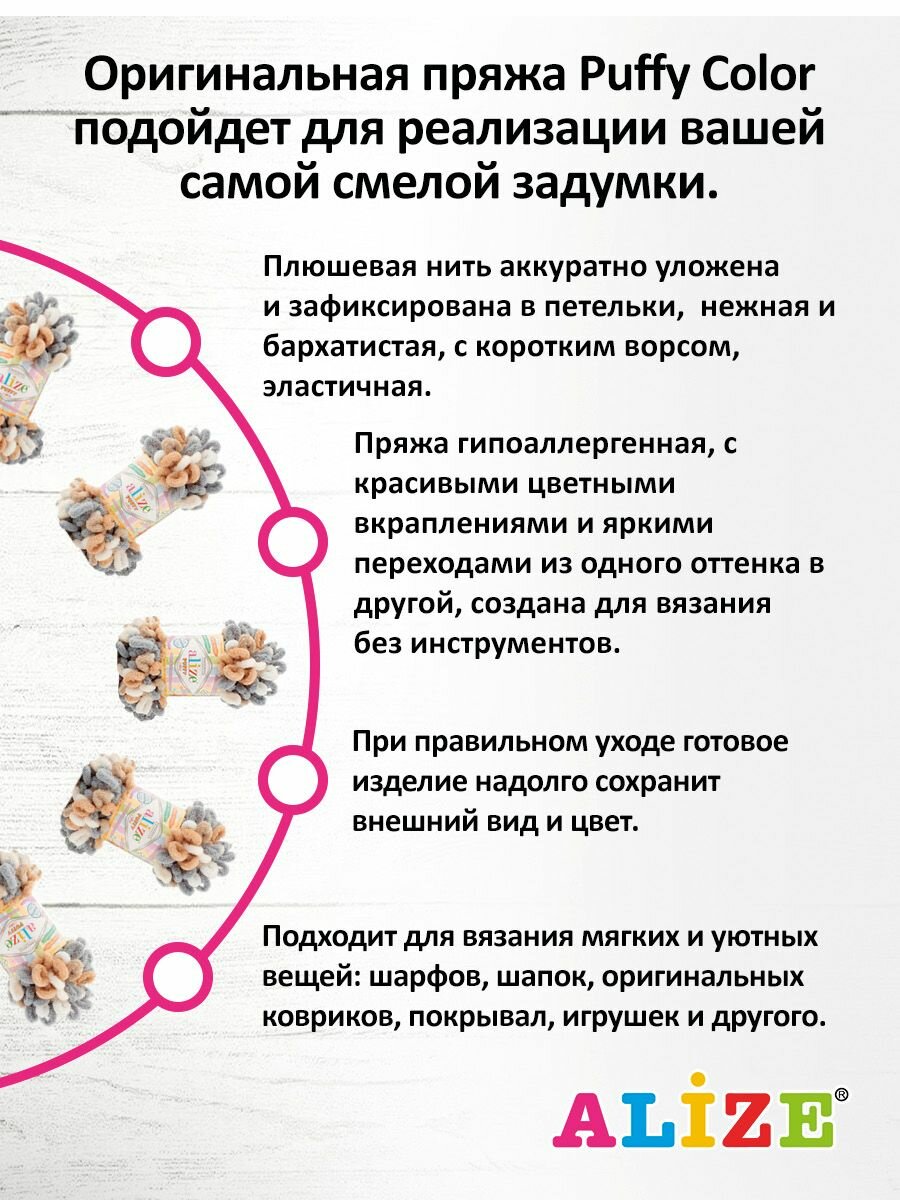 Пряжа для вязания плюшевая Alize Puffy Color, цвет 6493, 100г, 9м, 5 шт/упак