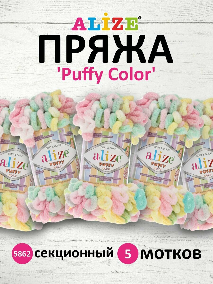 Пряжа PUFFY COLOR (Alize), лимон/розов/мята - 5862, 100% микрополиэстер, 5 мотков, 100 г, 9 м.