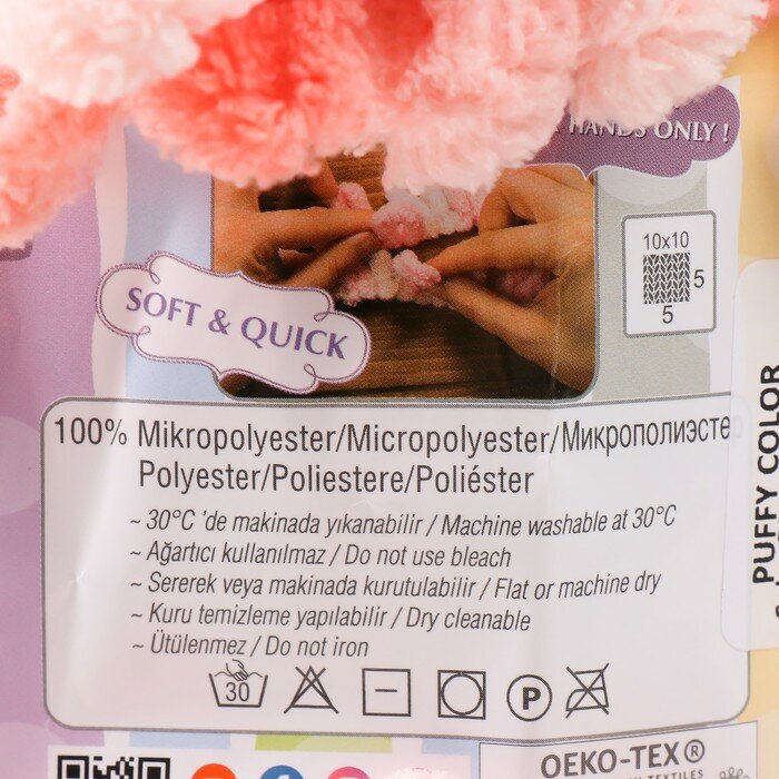 Пряжа PUFFY COLOR (Alize), сал/бир/сир/роз - 6526, 100% микрополиэстер, 5 мотков, 100 г, 9 м.
