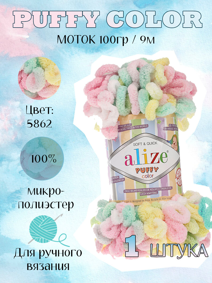 Пряжа PUFFY COLOR (Alize), лимон/розов/мята - 5862, 100% микрополиэстер, 5 мотков, 100 г, 9 м.