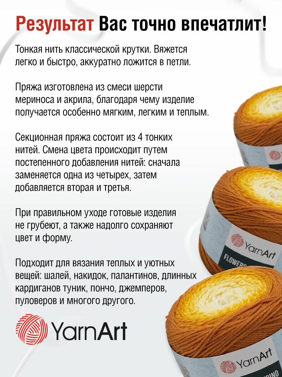 СохранитьПряжа Yarnart Flowers Merino желтый-оранжевый (552), 25%шерсть/75%акрил, 590м, 225г, 2шт интересное: