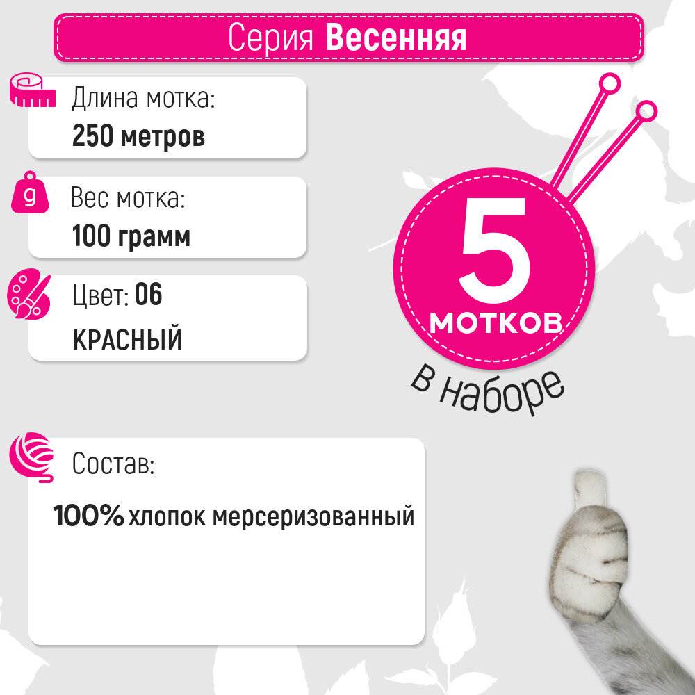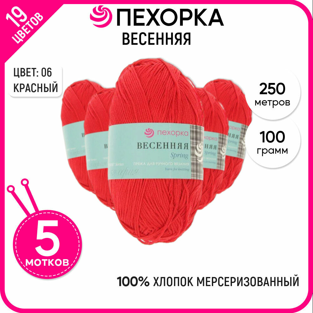 Пряжа для вязания крючком, спицами Пехорка Pehorka Весенняя, средняя, хлопок мерсеризованный 100%, цвет 06, красный, 5 шт. по 100 г, 250 м