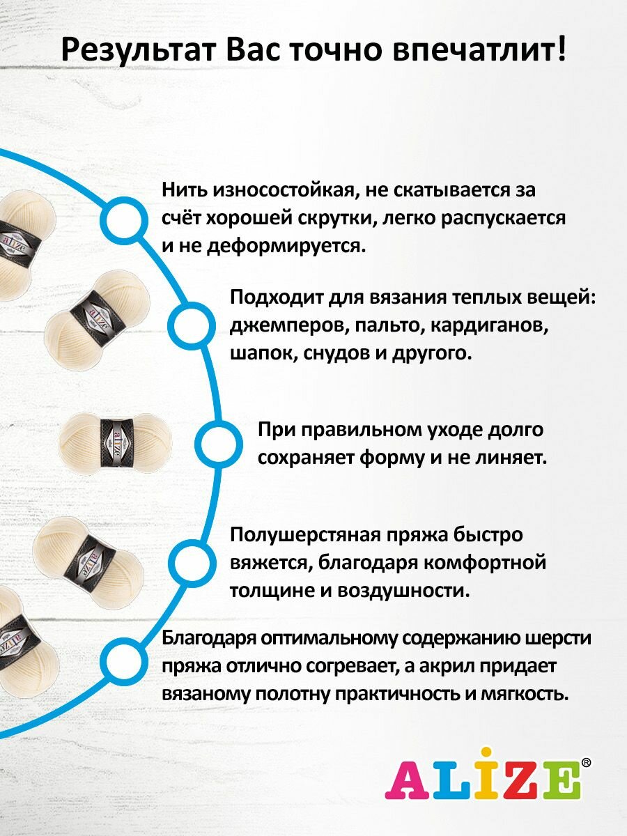 СохранитьПряжа ALIZE "SUPERLANA MIDI", 100 гр 170 м, 25% шерсть, 75% акрил, 1 светло-молочный, 5 шт интересное: