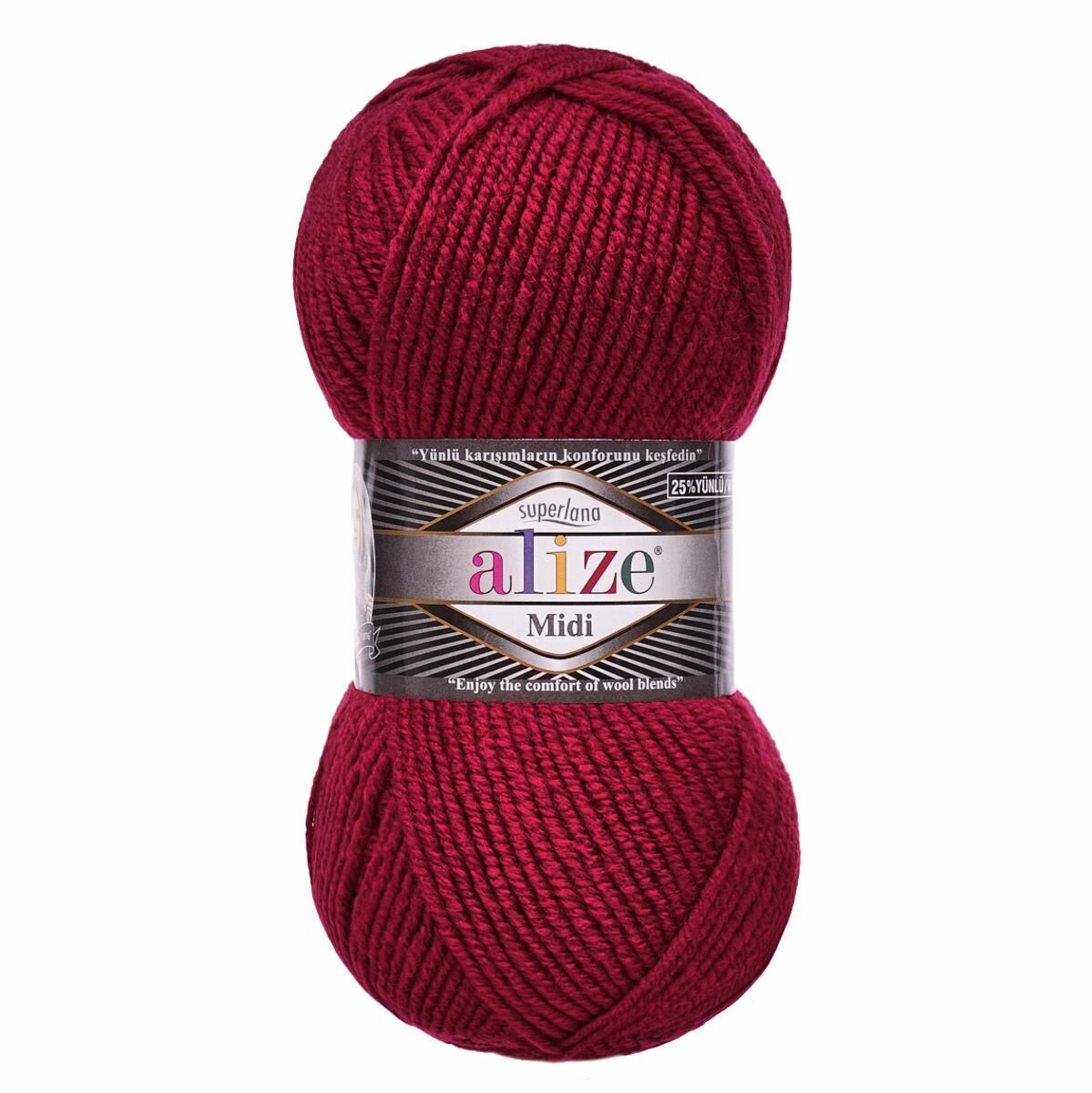 Пряжа Alize Superlana midi (Ализе Суперлана миди) - 2 шт Цвет: 57 бордовый, 75% акрил 25% шерсть, 100 г 170 м