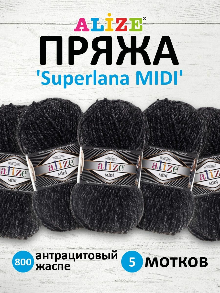 Купить Пряжа для вязания ALIZE 'Superlana MIDI', 100г, 170м (25% шерсть, 75% акрил) (800 антрацитовый жаспе), 5 мотков