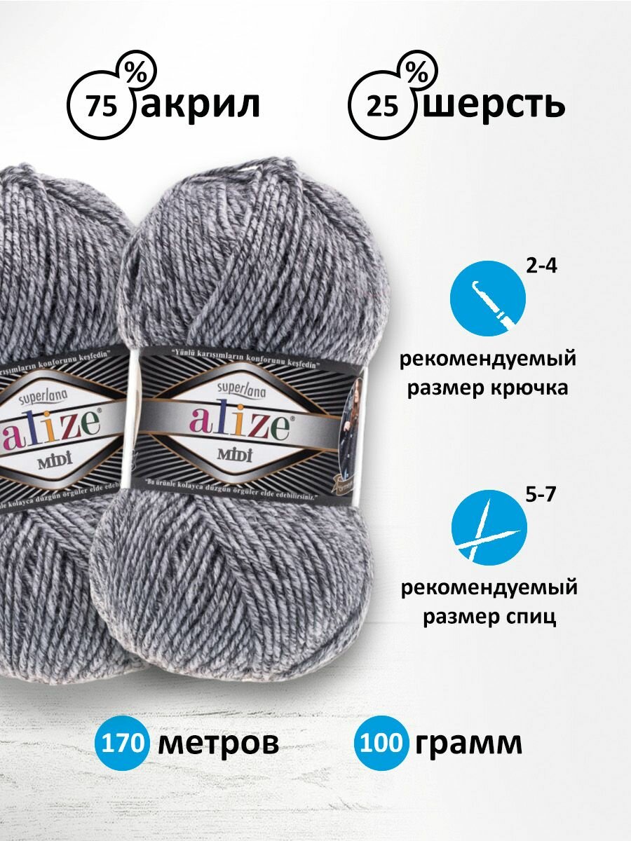 Пряжа ALIZE SUPERLANA MIDI, серый меланж - 182, 25% шерсть, 75% акрил, 5 мотков, 100 г, 170 м.