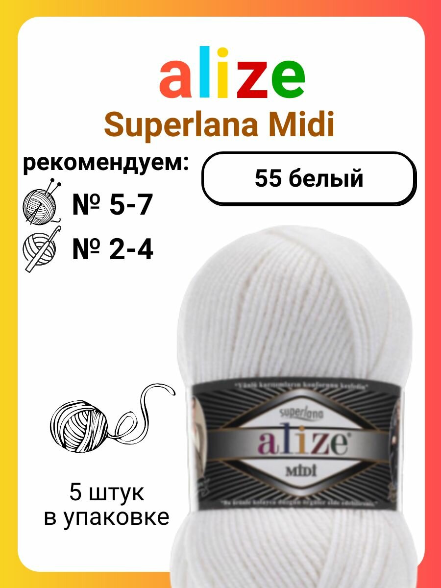 Пряжа ALIZE SUPERLANA MIDI, белый - 55, 25% шерсть, 75% акрил, 5 мотков, 100 г, 170 м.
