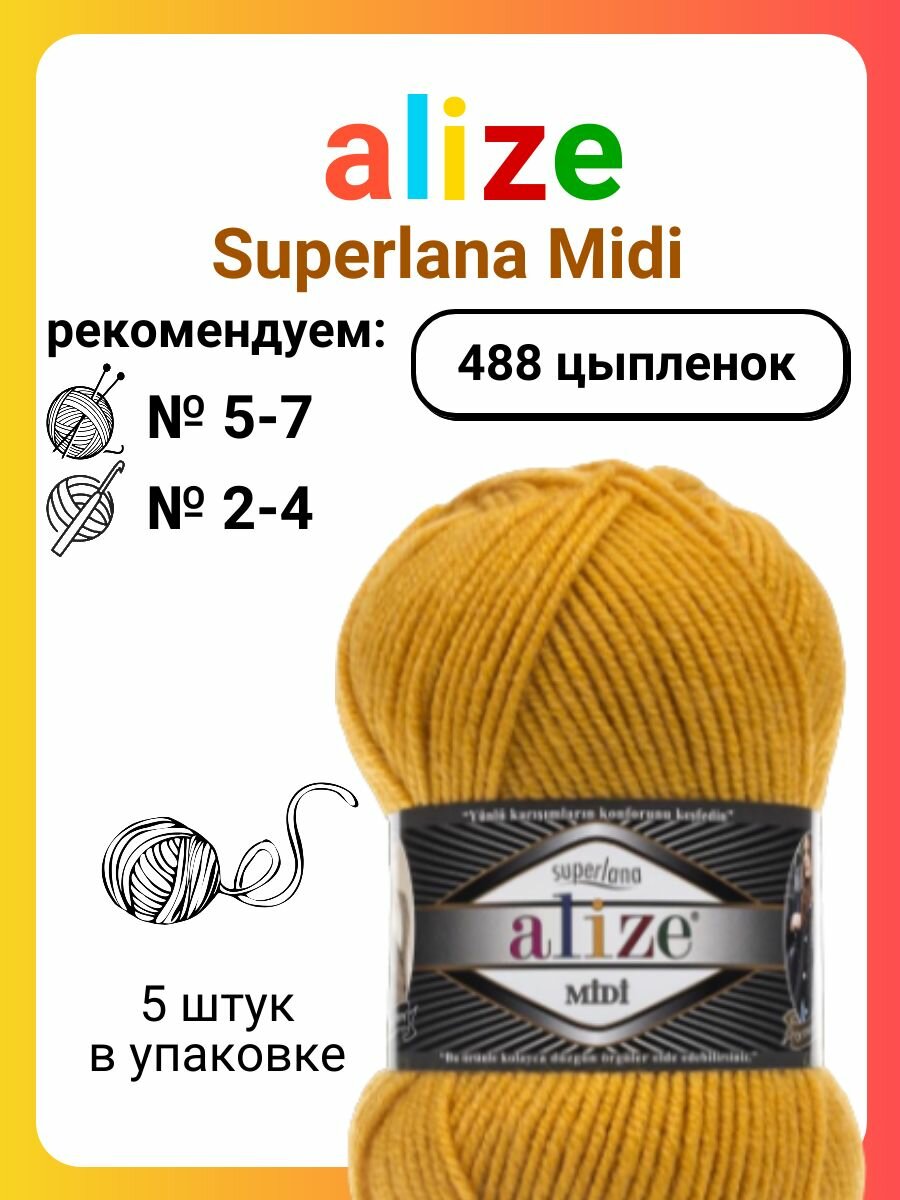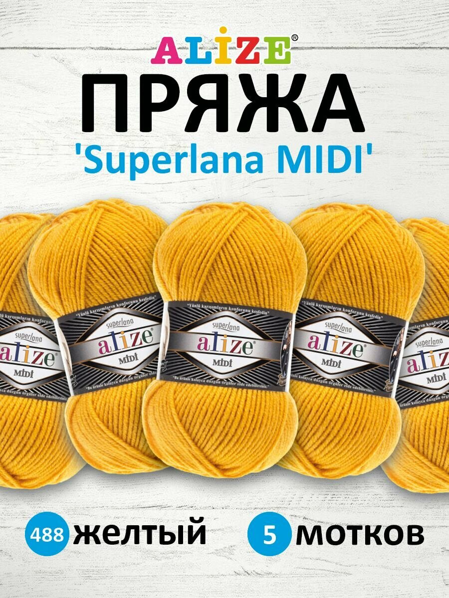 Купить Пряжа для вязания ALIZE 'Superlana MIDI', 100г, 170м (25% шерсть, 75% акрил) (488 желтый), 5 мотков
