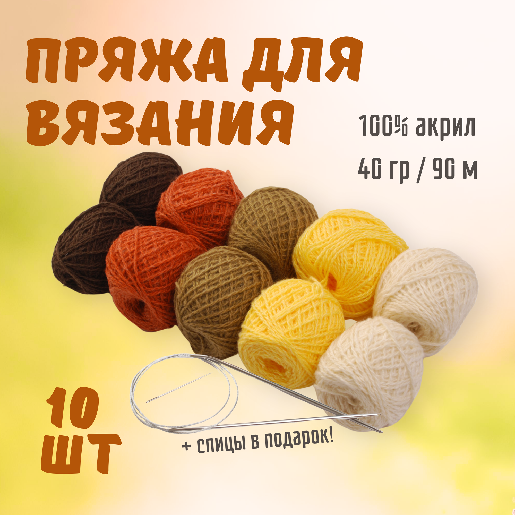 | Комплектация | 10 мотков, спицы круговые №3 80 см. |