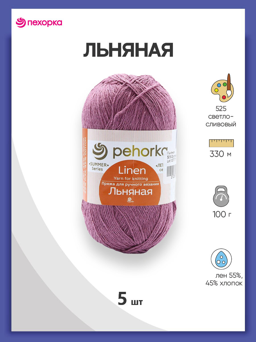 СохранитьПряжа Льняная (Пехорка), Св.слива - 525, 55% лен, 45% хлопок, 5 мотков, 100 г., 330 м. интересное: