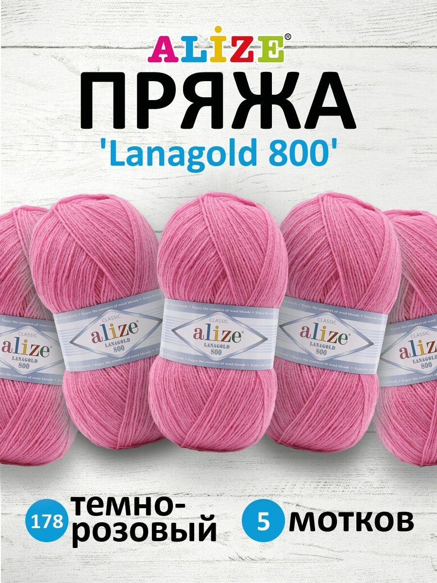 Пряжа ALIZE LANAGOLD 800, яр. розовый - 178, 49% шерсть, 51% акрил, 5 мотков, 100 г, 730 м.