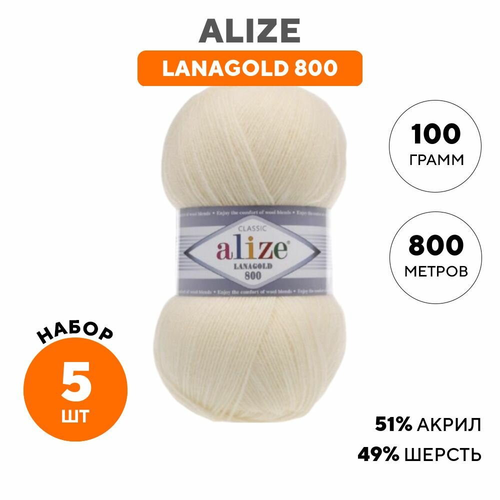 Пряжа Alize Lanagold 800 (Ланаголд 800) - 5 мотков Цвет: 62 молочный (Ланаголд 800) 49% шерсть, 51% акрил 100г 730м