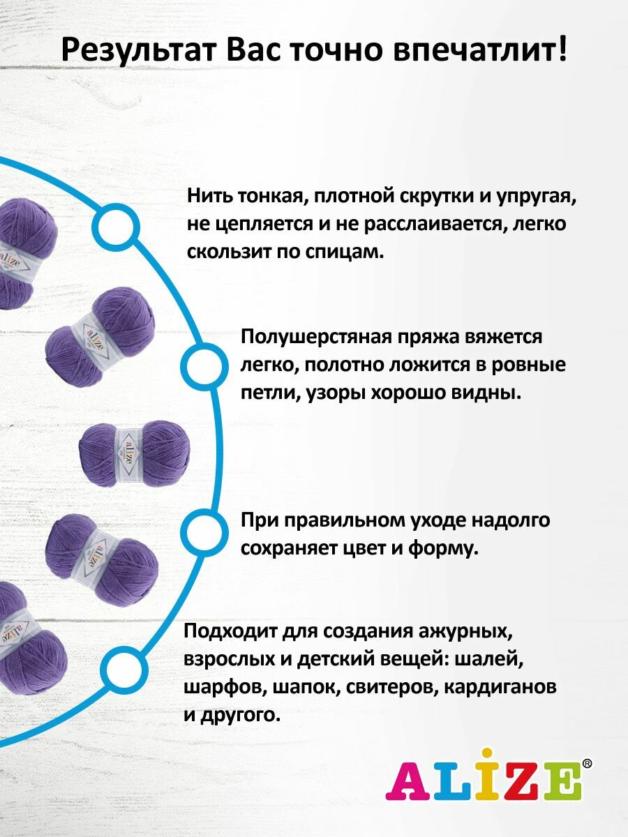 СохранитьПряжа ALIZE LANAGOLD 800, тем.сирень - 851, 49% шерсть, 51% акрил, 5 мотков, 100 г., 730 м. интересное: