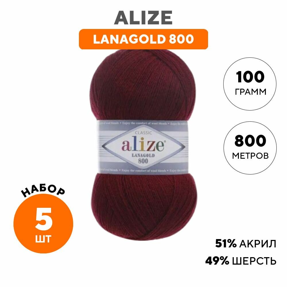 Пряжа Alize Lanagold 800 бордовый (57), 51%акрил/49%шерсть, 800м, 100г, 5шт