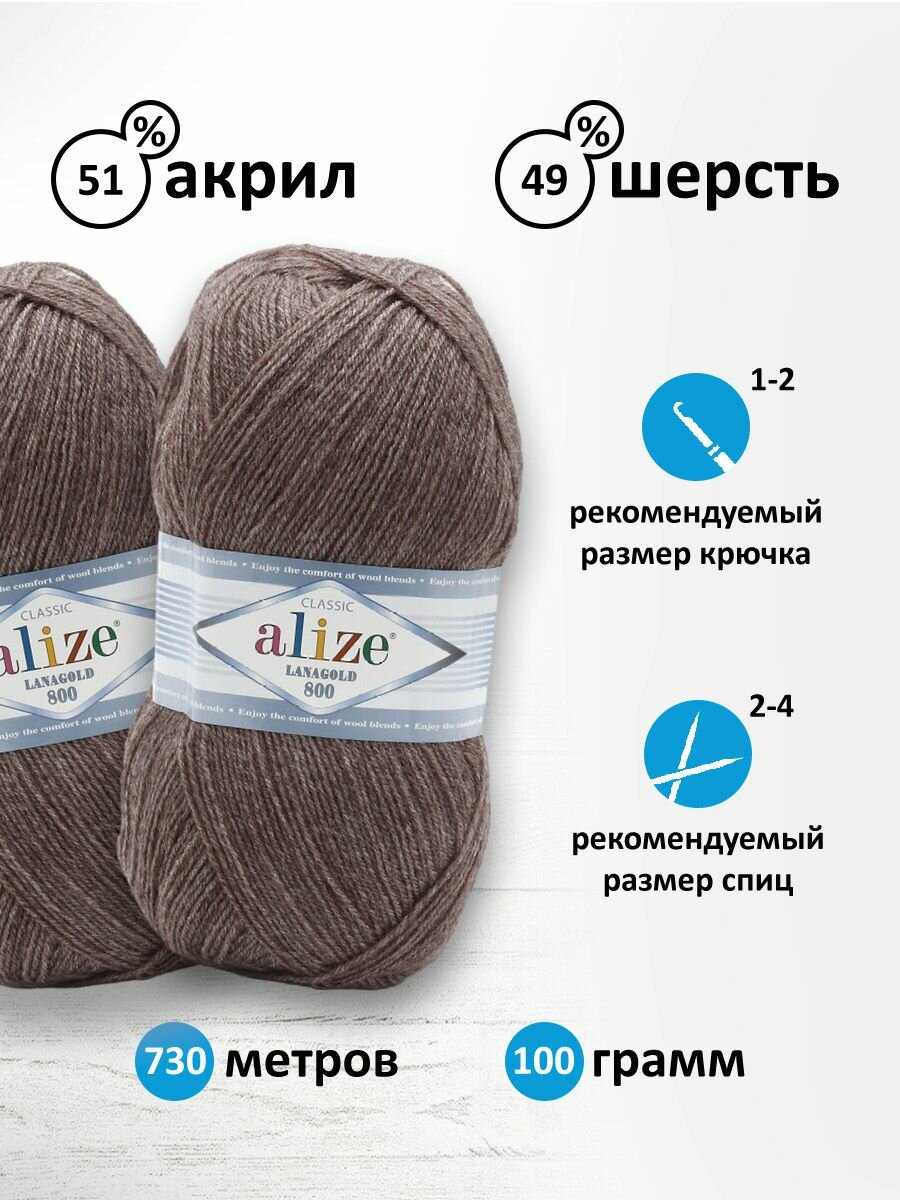 Пряжа для вязания крючком, спицами, Alize, Ализе, LanaGold 800, средняя, акрил, шерсть, цвет 173, какао, 5 шт. по 100 г, 800 м