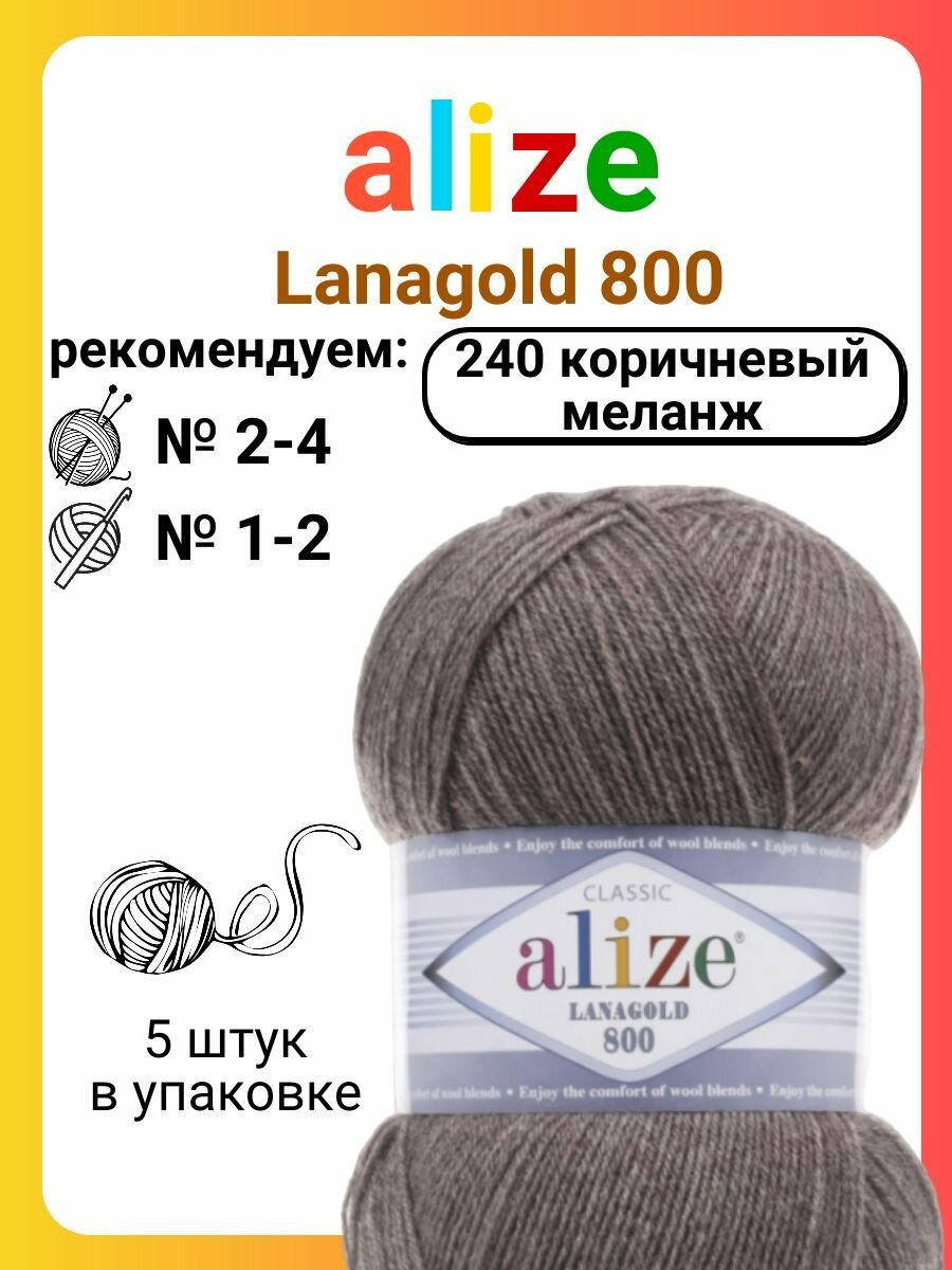 Купить Пряжа для вязания Alize Lanagold 800 (240) коричневый меланж, 100 г, 800 м, 5 штук
