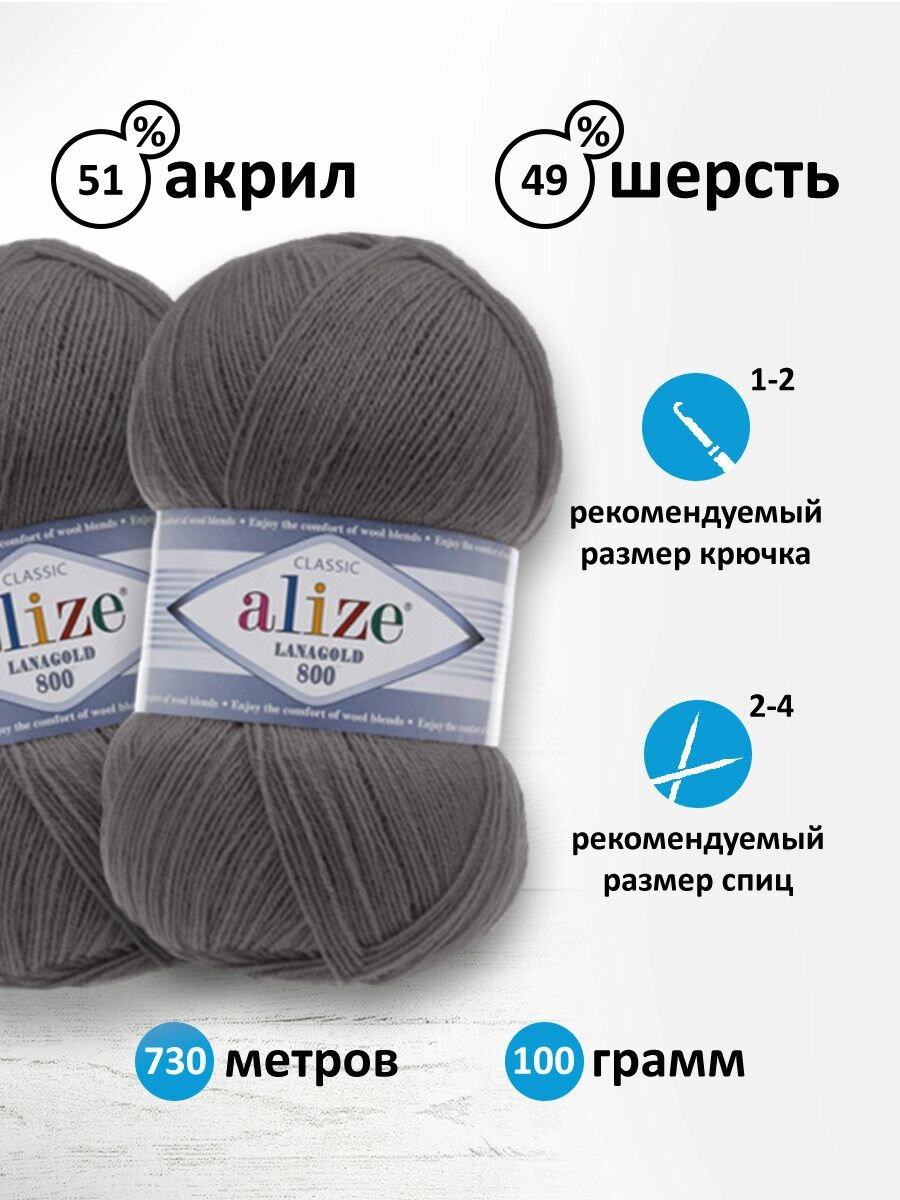 Пряжа ALIZE LANAGOLD 800, средне-серый - 182, 49% шерсть, 51% акрил, 5 мотков, 100 г, 730 м.