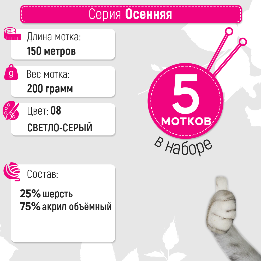 Пряжа Пехорка Осенняя цвет 08 светло-серый (200г/150м, упаковка 5 мотков)