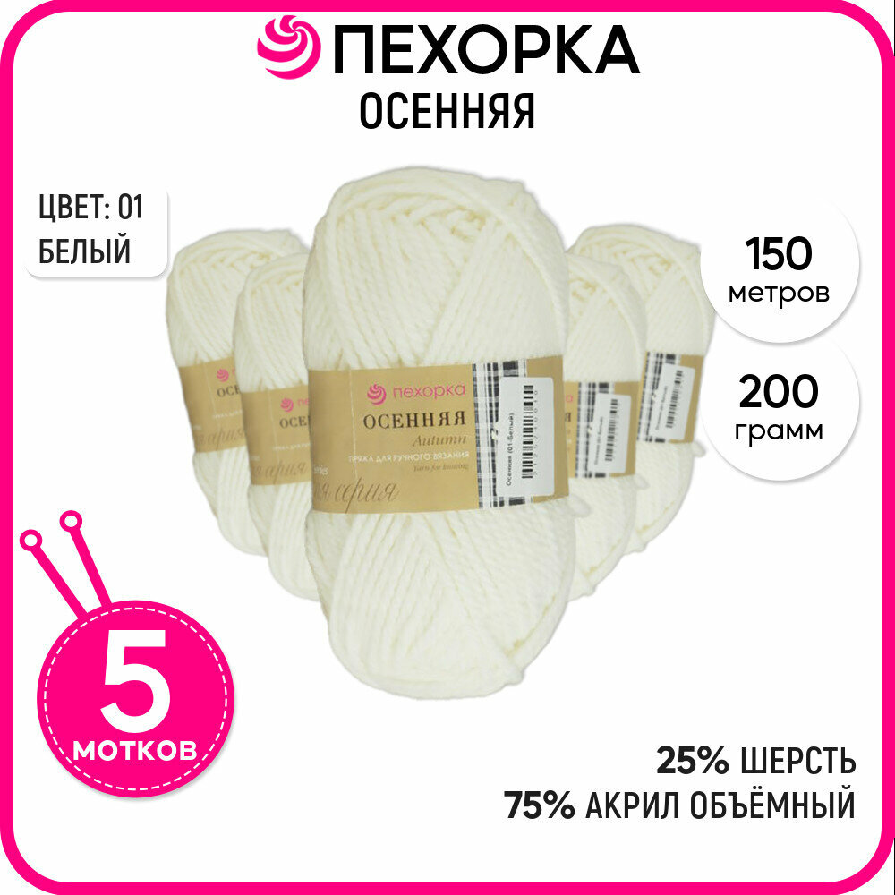 СохранитьПряжа для вязания Пехорка 'Осенняя', 200г, 150м (25% шерсть, 75% акрил) (01 белый), 5 мотков интересное: