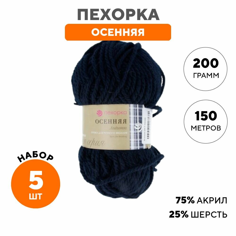 Пряжа Пехорка Осенняя цвет 04 тёмно-синий (200г/150м, упаковка 5 мотков)