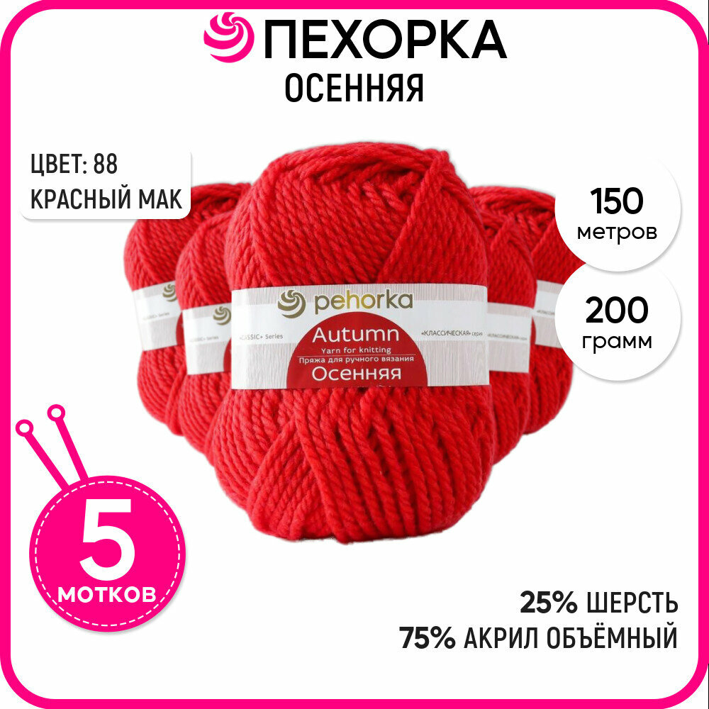 Купить Пряжа Пехорка Осенняя красный мак (088), 25%шерсть/75%акрил, 150м, 200г, 5шт