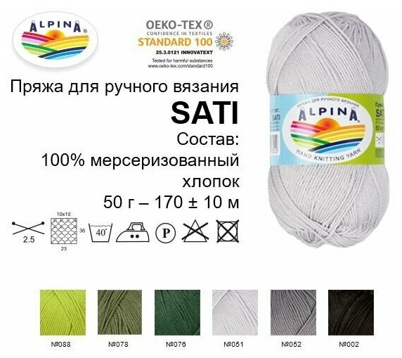 Пряжа ALPINA "SATI" №051 св.серый 1 шт. х 50 г 170 м 100% мерсеризованный хлопок альпина сати