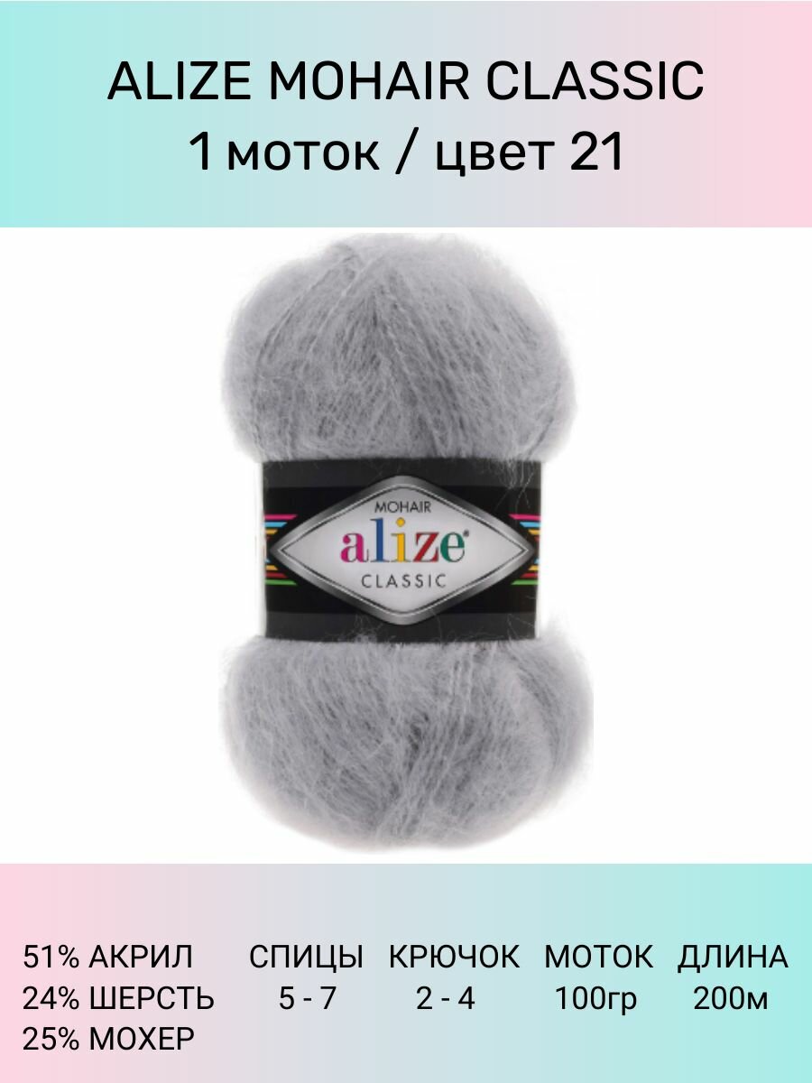 Пряжа Alize Mohair Classic серый (21), 24%шерсть/25%мохер/51%акрил, 200м, 100г, 3шт