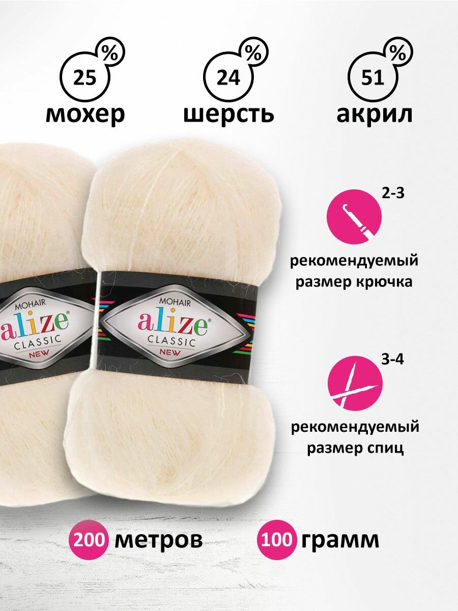 Пряжа Alize Mohair Classic New (Мохер Классик Нью) - 5 мотков Цвет: 67 молочно-бежевый 25% мохер, 24% шерсть, 51% акрил 100г 200м