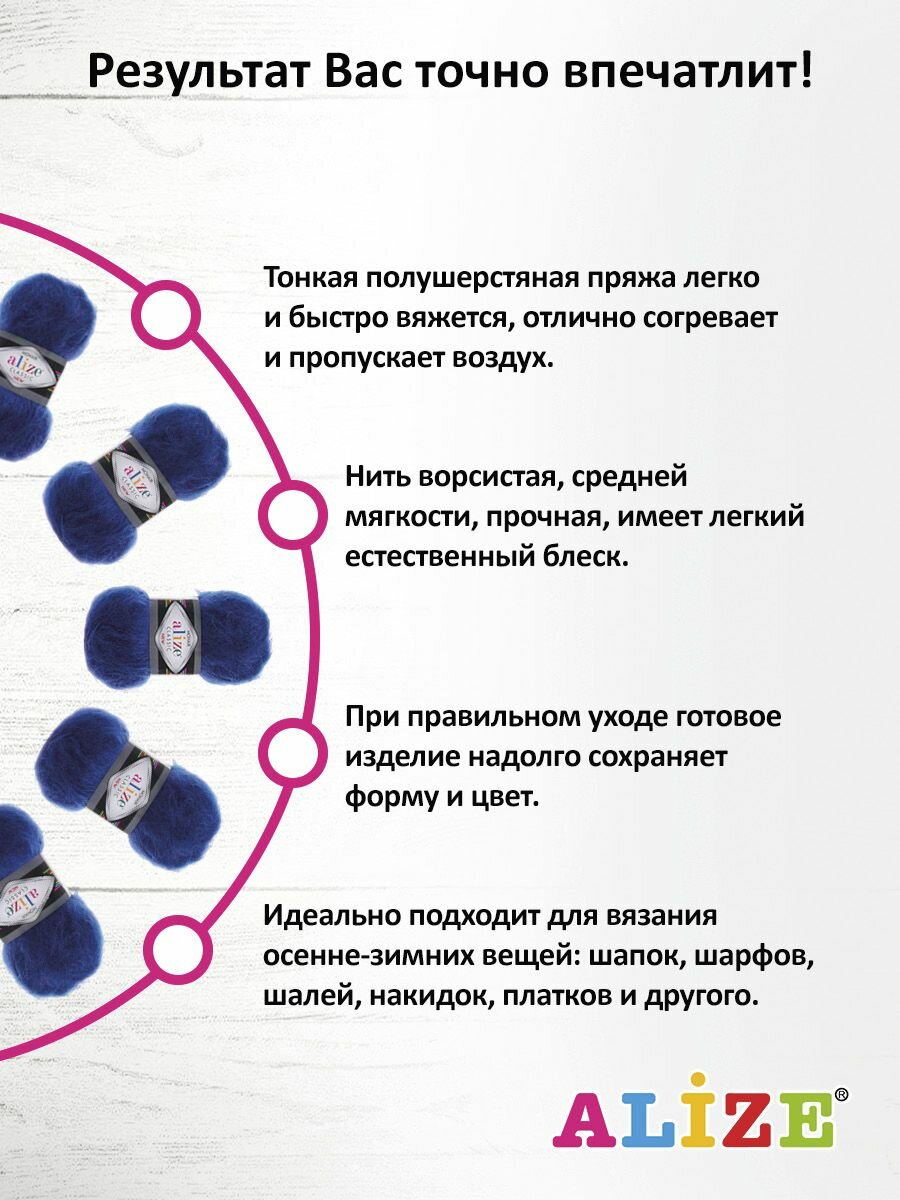 СохранитьПряжа для вязания ALIZE 'Mohair classic new', 100г, 200м (25% мохер, 24% шерсть, 51% акрил) (409 индиго), 5 мотков интересное:
