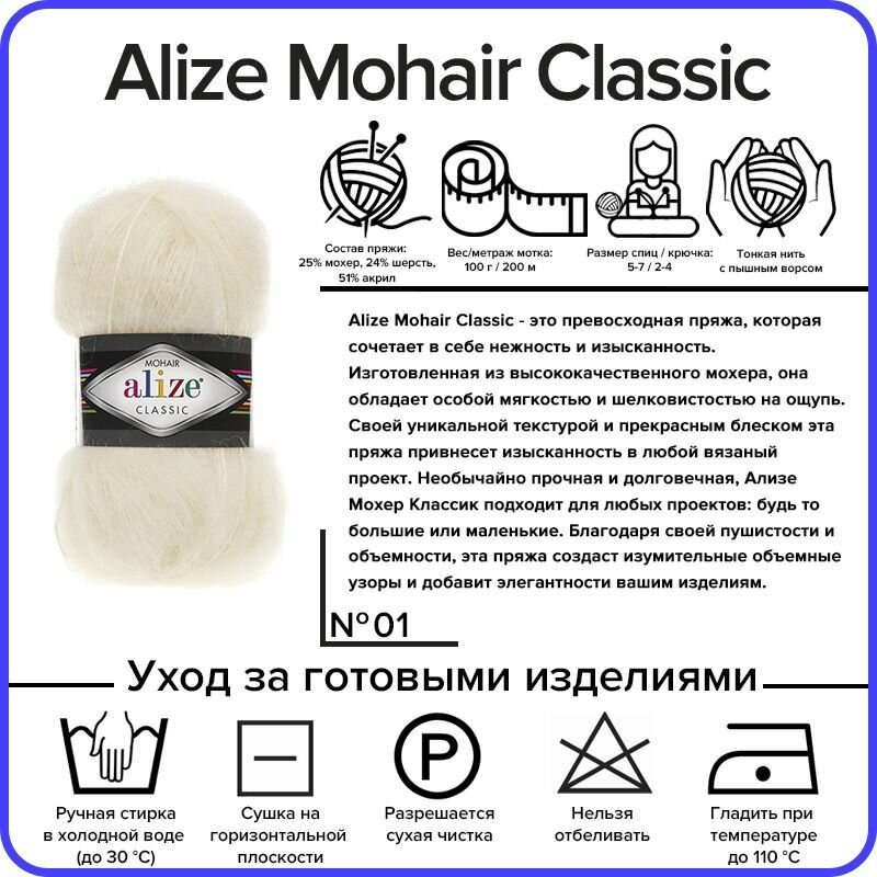 Пряжа Alize Mohair Classic молочно-бежевый (67), 24%шерсть/25%мохер/51%акрил, 200м, 100г, 1шт