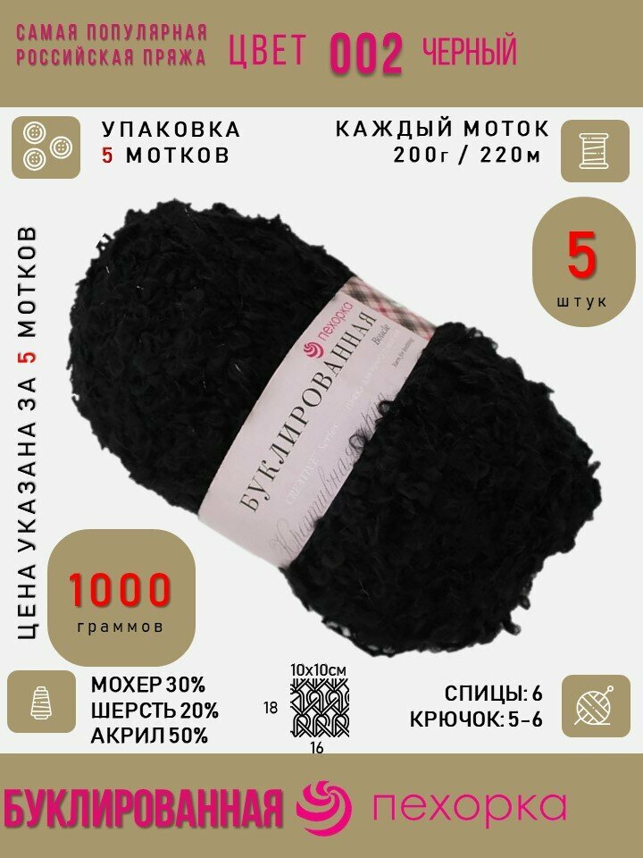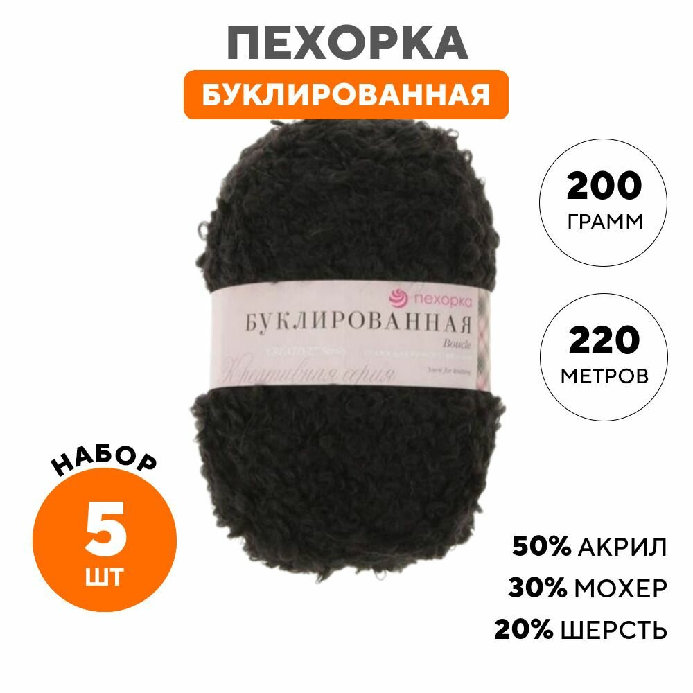Пряжа Пехорка Буклированная цвет 02 черный (200г/220м, упаковка 5 мотков)