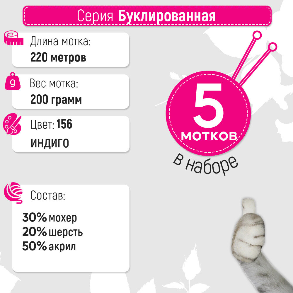 СохранитьПряжа для вязания Пехорка 'Буклированная', 200г, 220м (30% мохер, 20% шерсть, 50% акрил высокообъемный) (156 индиго), 5 мотков интересное: