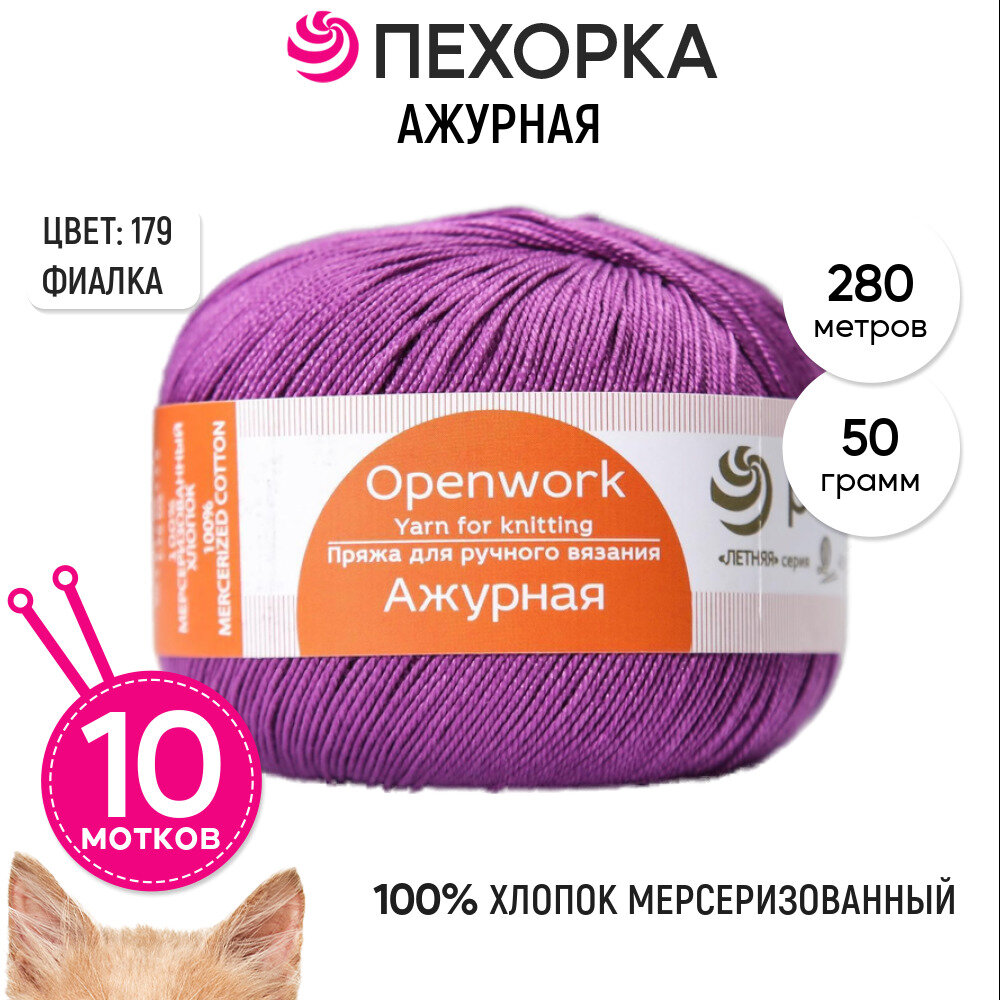 Пряжа Ажурная (Пехорка), Фиалка - 179, 100% мерсеризованный хлопок, 10 мотков, 50 г, 280 м.