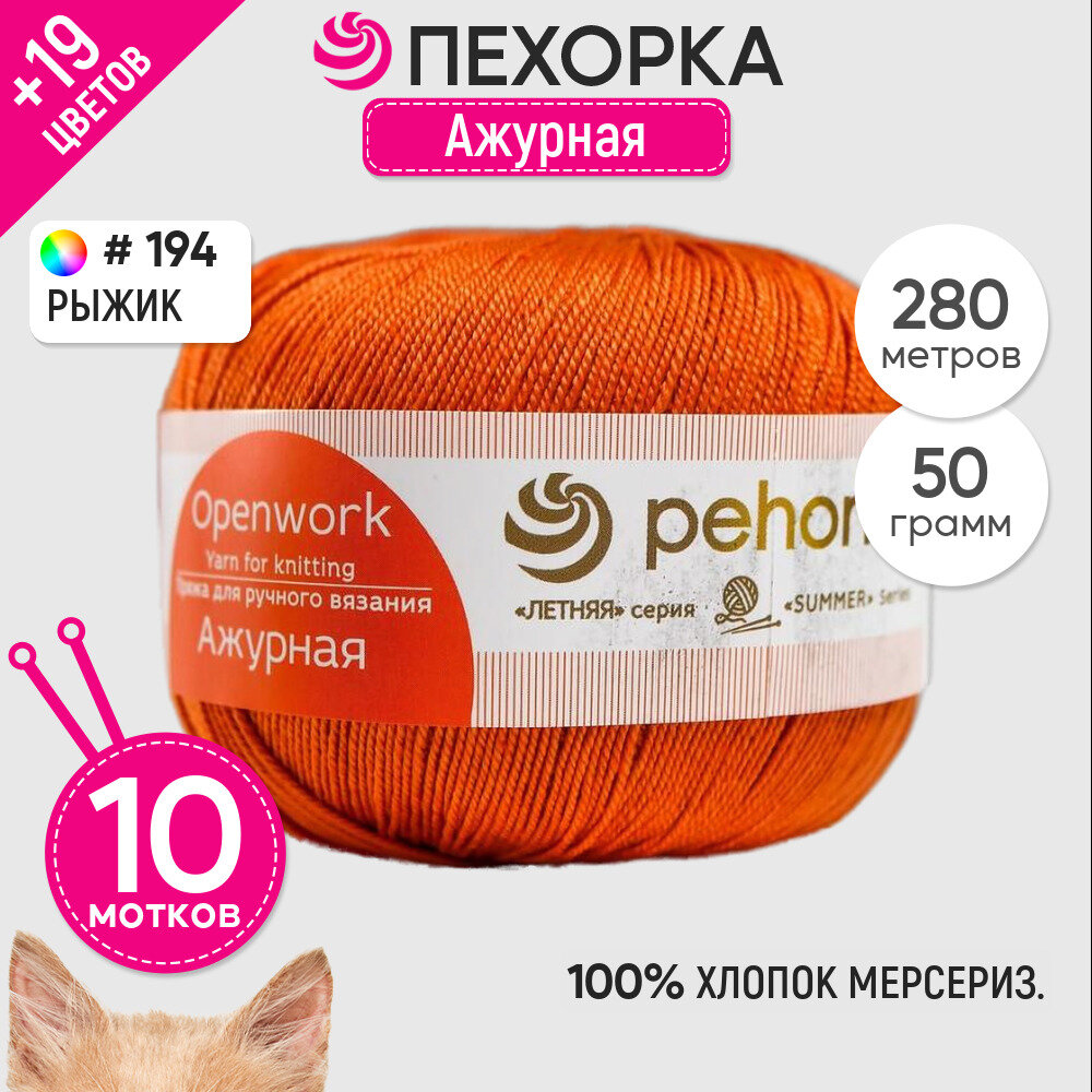СохранитьПряжа Ажурная (Пехорка), Рыжик - 194, 100% мерсеризованный хлопок, 10 мотков, 50 г., 280 м. интересное: