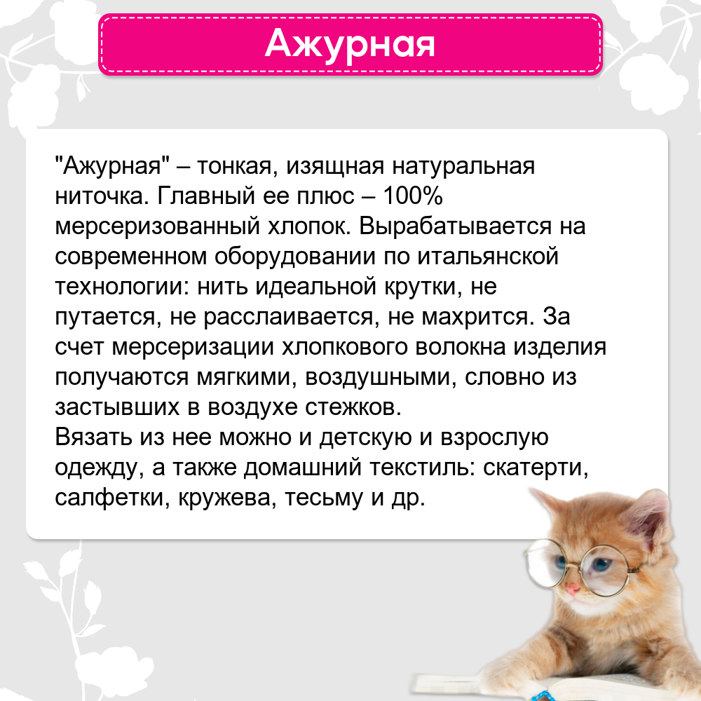 | Дополнительная информация | Назначение пряжи: ажурное вязание, аксессуары и предметы интерьера, декорирование |