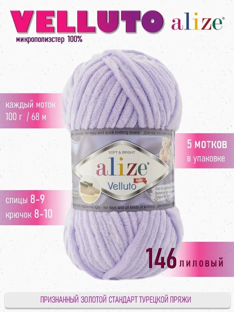 Пряжа VELLUTO (Alize), сирень св - 146, 100% микрополиэстер, 5 мотков, 100 г, 68 м.