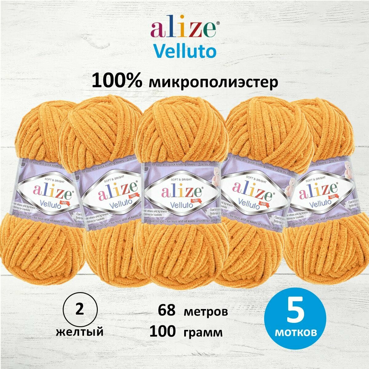Купить Пряжа Alize Velluto горчица (02), 100%микрополиэстер, 68м, 100г, 5шт
