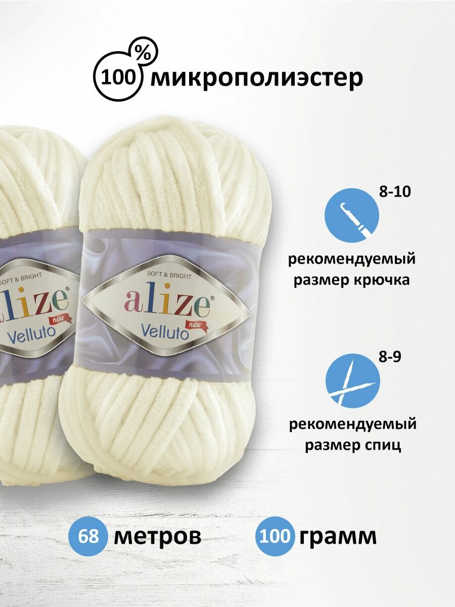 Пряжа Alize Velluto, 100% микрополиэстер, 68м/100г, цвет молочный, для спиц №8-9, 1 шт.