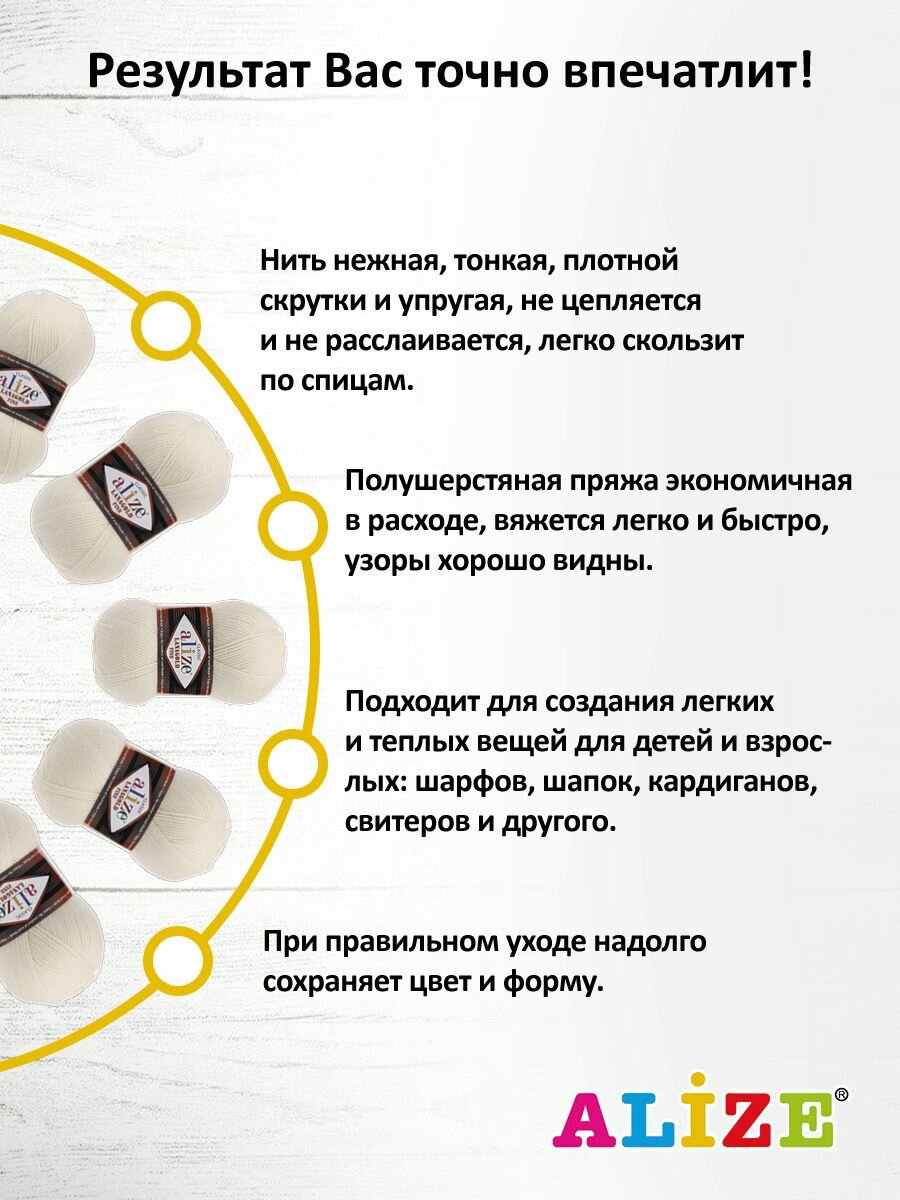 СохранитьПряжа ALIZE "Lanagold fine", 100 гр 390 м, 49% шерсть, 51% акрил, 62 молочный, 5 шт интересное: