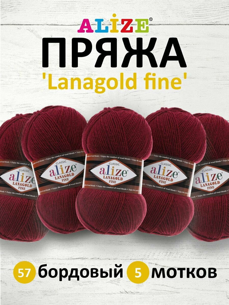 Пряжа для вязания ALIZE LANAGOLD FINE: 57 (бордовый), 5 шт 390 м 100 г, 49% шерсть 51% акрил