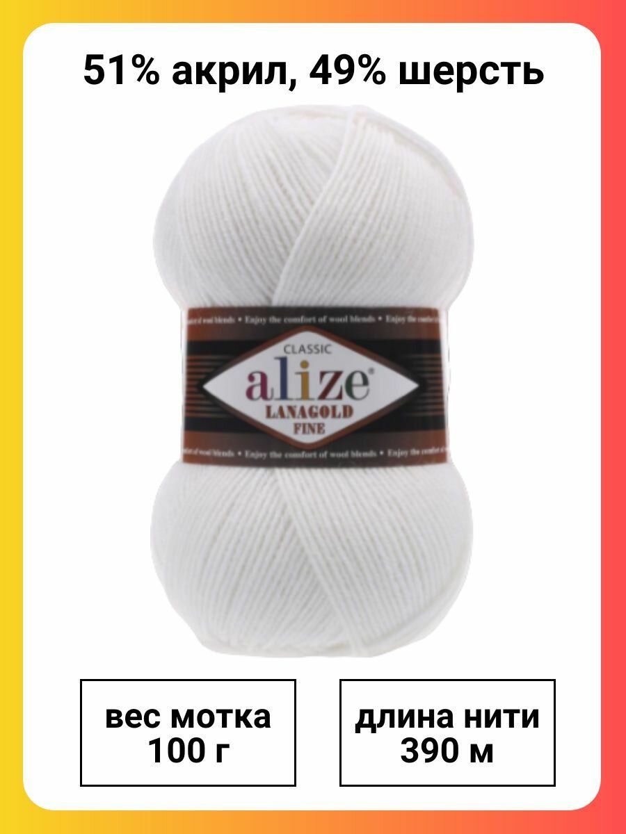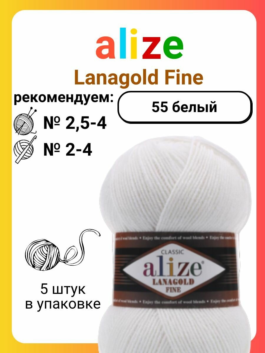 Купить Пряжа ALIZE "Lanagold fine", 100 гр 390 м, 49% шерсть, 51% акрил, 55 белый, 5 шт