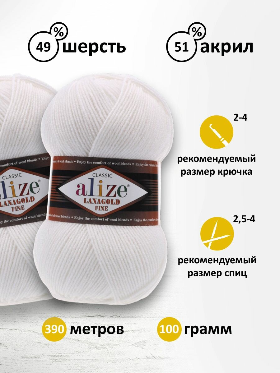 Ниже Вы можете прочитать отзывы на Пряжа ALIZE "Lanagold fine", 100 гр 390 м, 49% шерсть, 51% акрил, 55 белый, 5 шт, ознакомится с подробными характеристиками, посмотреть интересные обзоры и фотографии на Пряжа ALIZE "Lanagold fine", 100 гр 390 м, 49% шерсть, 51% акрил, 55 белый, 5 шт.