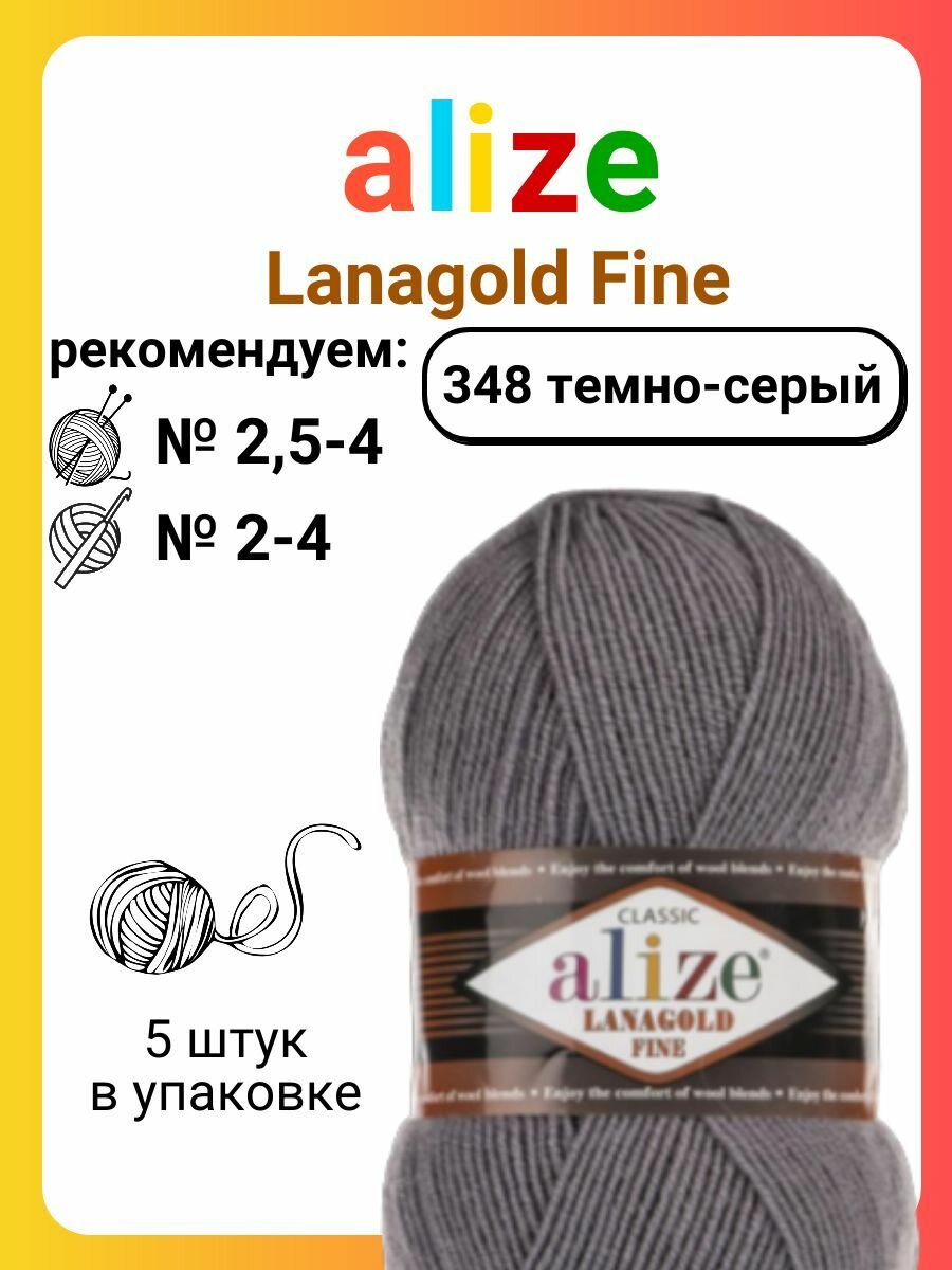 Пряжа ALIZE LANAGOLD FINE, т. серый - 348, 49% шерсть, 51% акрил, 5 мотков, 100 г, 390 м.
