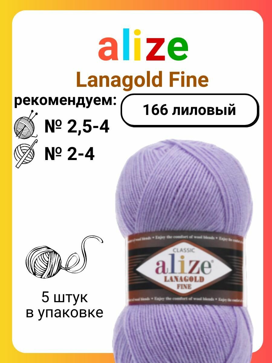 Купить Пряжа ALIZE LANAGOLD FINE, сиреневый - 166, 49% шерсть, 51% акрил, 5 мотков, 100 г., 390 м.