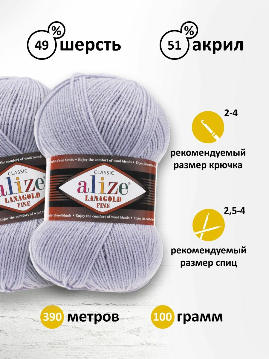 Пряжа для вязания ALIZE LANAGOLD FINE: 505 (пепельно-сиреневый), 3 шт 390 м 100 г, 49% шерсть 51% акрил