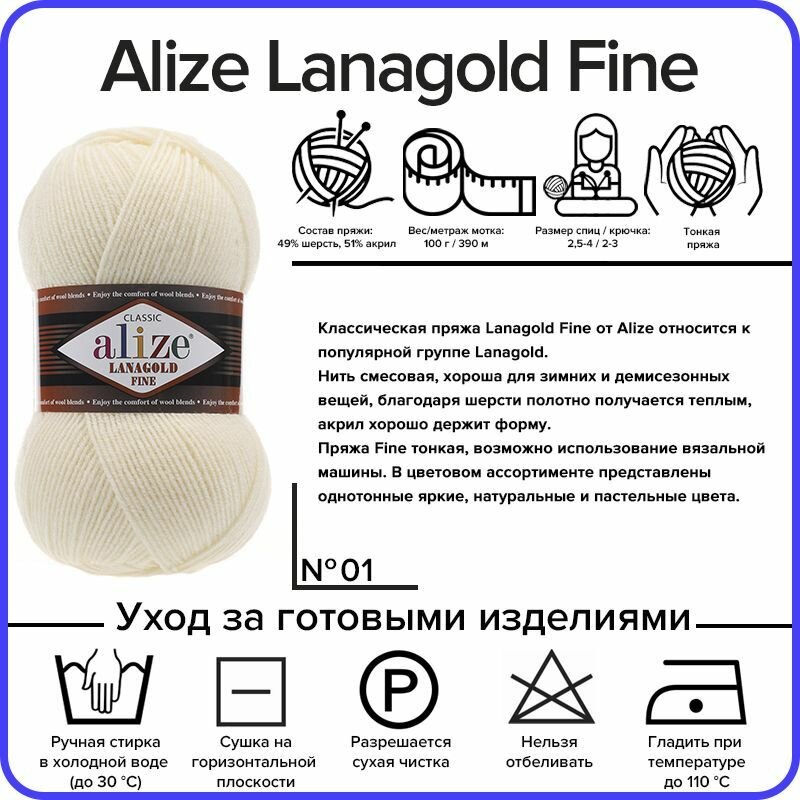 Пряжа Alize Lanagold Fine кремовый (01), 51%акрил/49%шерсть, 390м, 100г, 1шт