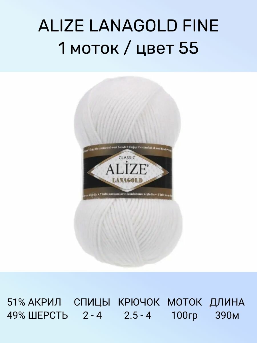 Купить Пряжа Alize Lanagold Fine белый (55), 51%акрил/49%шерсть, 390м, 100г, 1шт