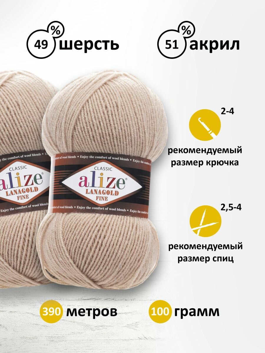 Пряжа для вязания ALIZE LANAGOLD FINE: 5 (бежевый), 5 шт 390 м 100 г, 49% шерсть 51% акрил