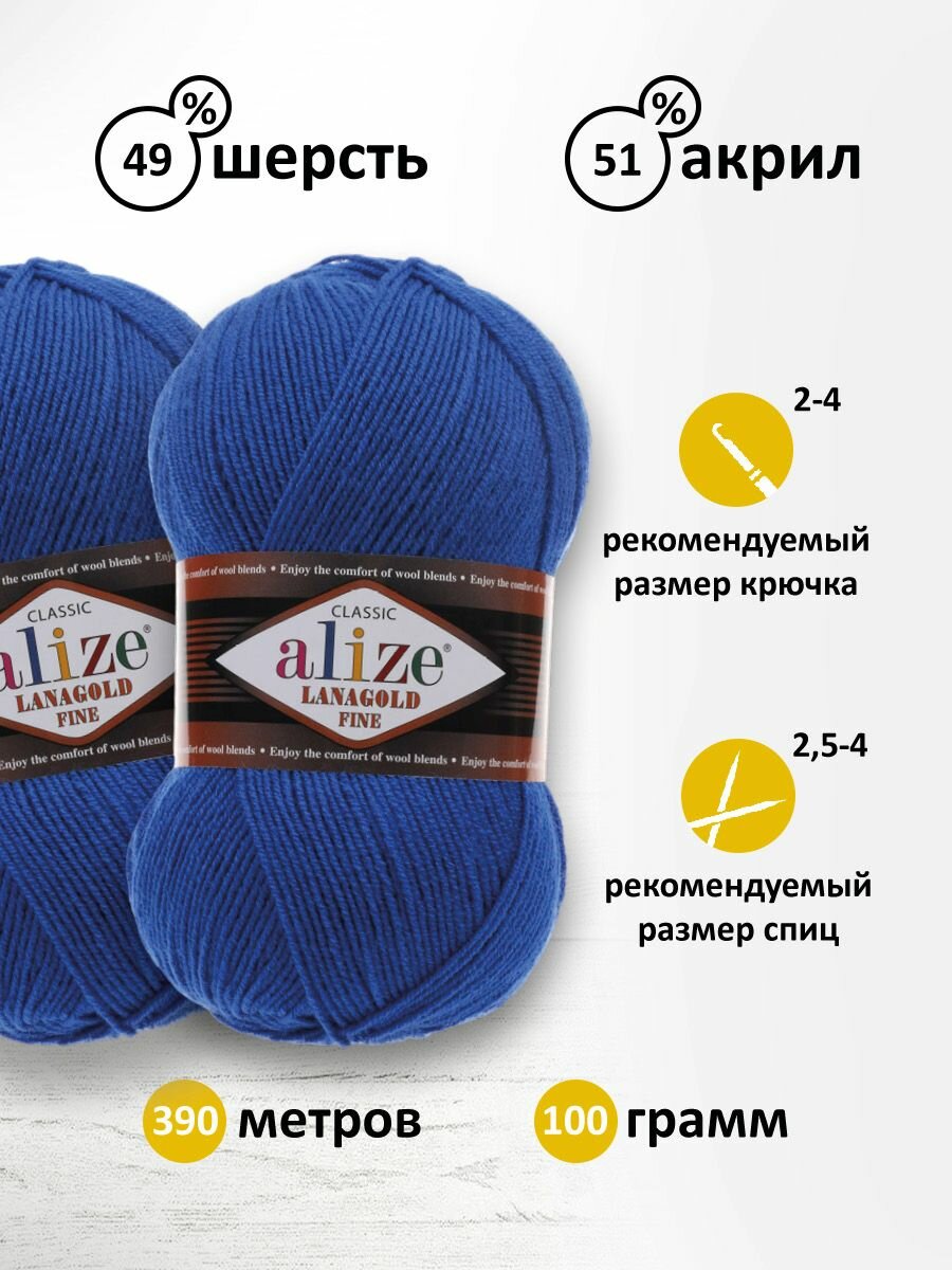 Пряжа для вязания ALIZE LANAGOLD FINE: 58 (т.синий), 3 шт 390 м 100 г, 49% шерсть 51% акрил